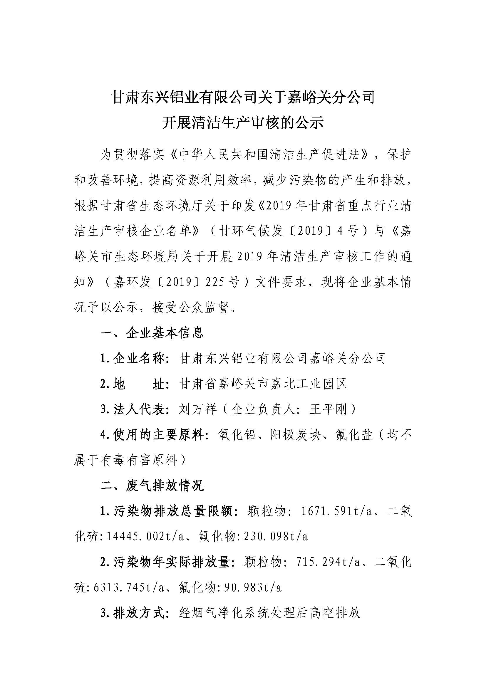 甘肅東興鋁業(yè)有限公司關(guān)于嘉峪關(guān)分公司開展清潔生產(chǎn)審核的公示