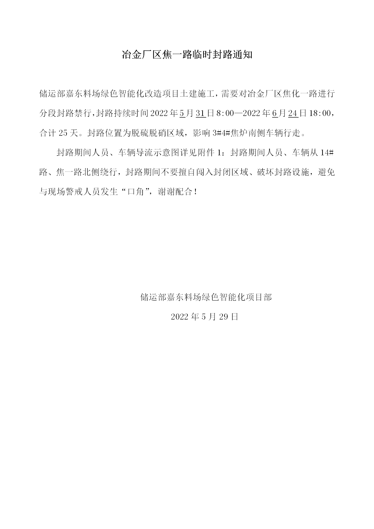 冶金廠區(qū)焦一路臨時封路通知